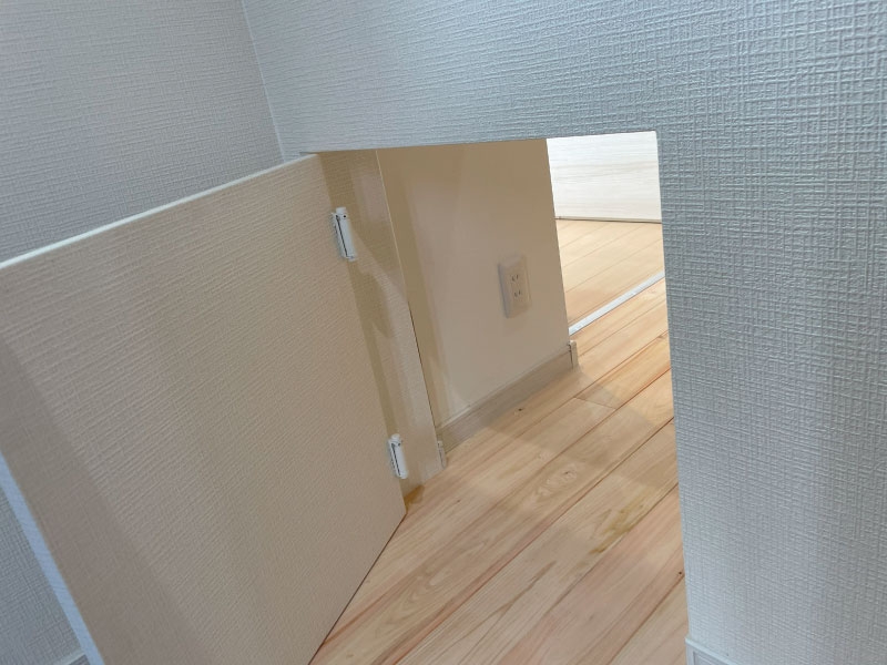 1階には幼いお子様のお昼寝用、または来客用にと部屋を設け、 明るく白いクロスと素足が気持ちいい!無垢の床がナチュラルな雰囲気のリビングになりました! お子様が小さいと細々したものなど増えがち。1階にはあちこちに収納を設けました。